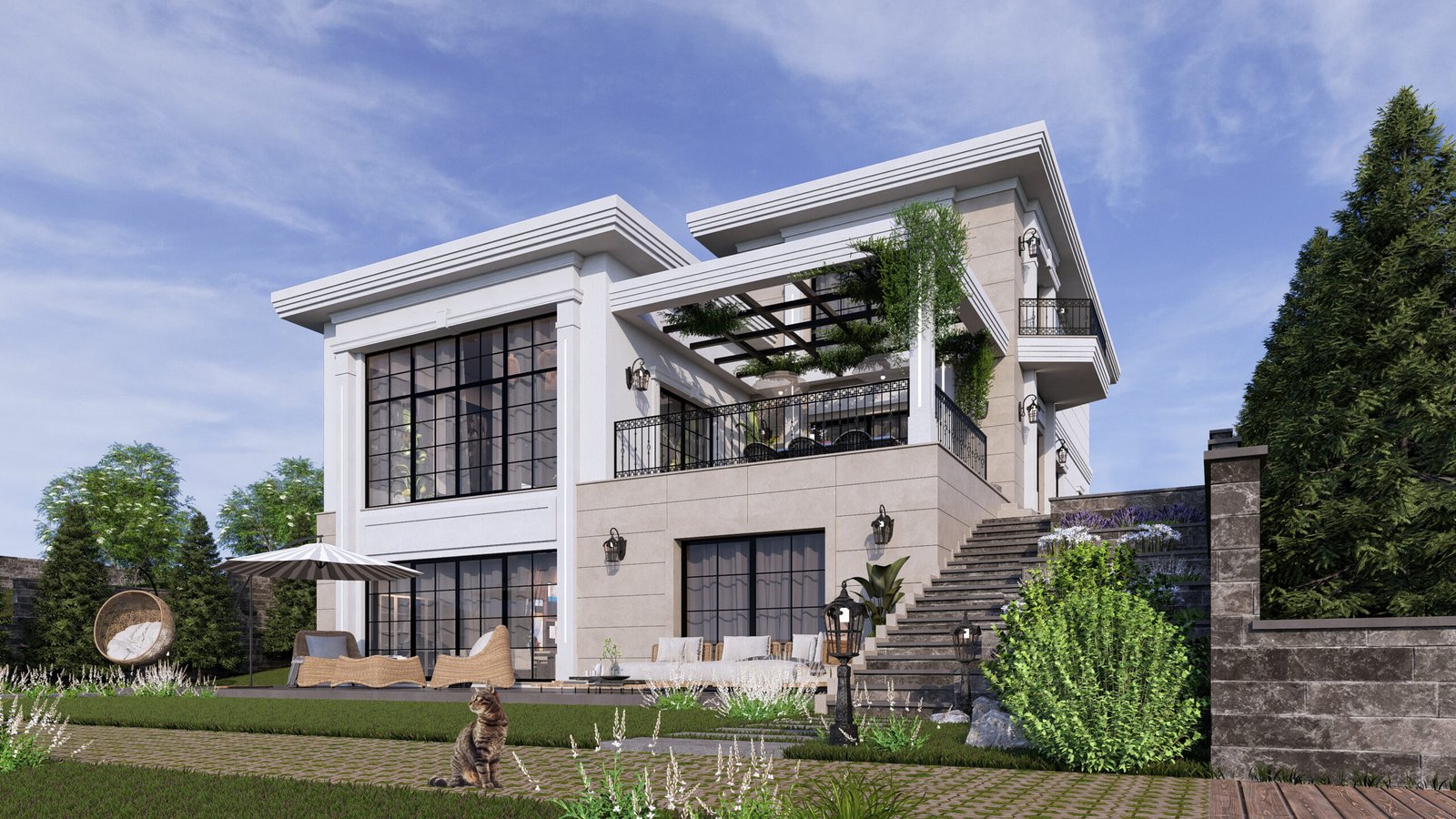 Dış mekanlarda yer alan zarif peyzaj elemanları, yapının mimari kimliğini desteklerken sakin ve huzurlu bir yaşam atmosferi sunar. Doğayla bütünleşen bu düzenleme, hem estetik hem de fonksiyonel bir kullanım alanı yaratır.