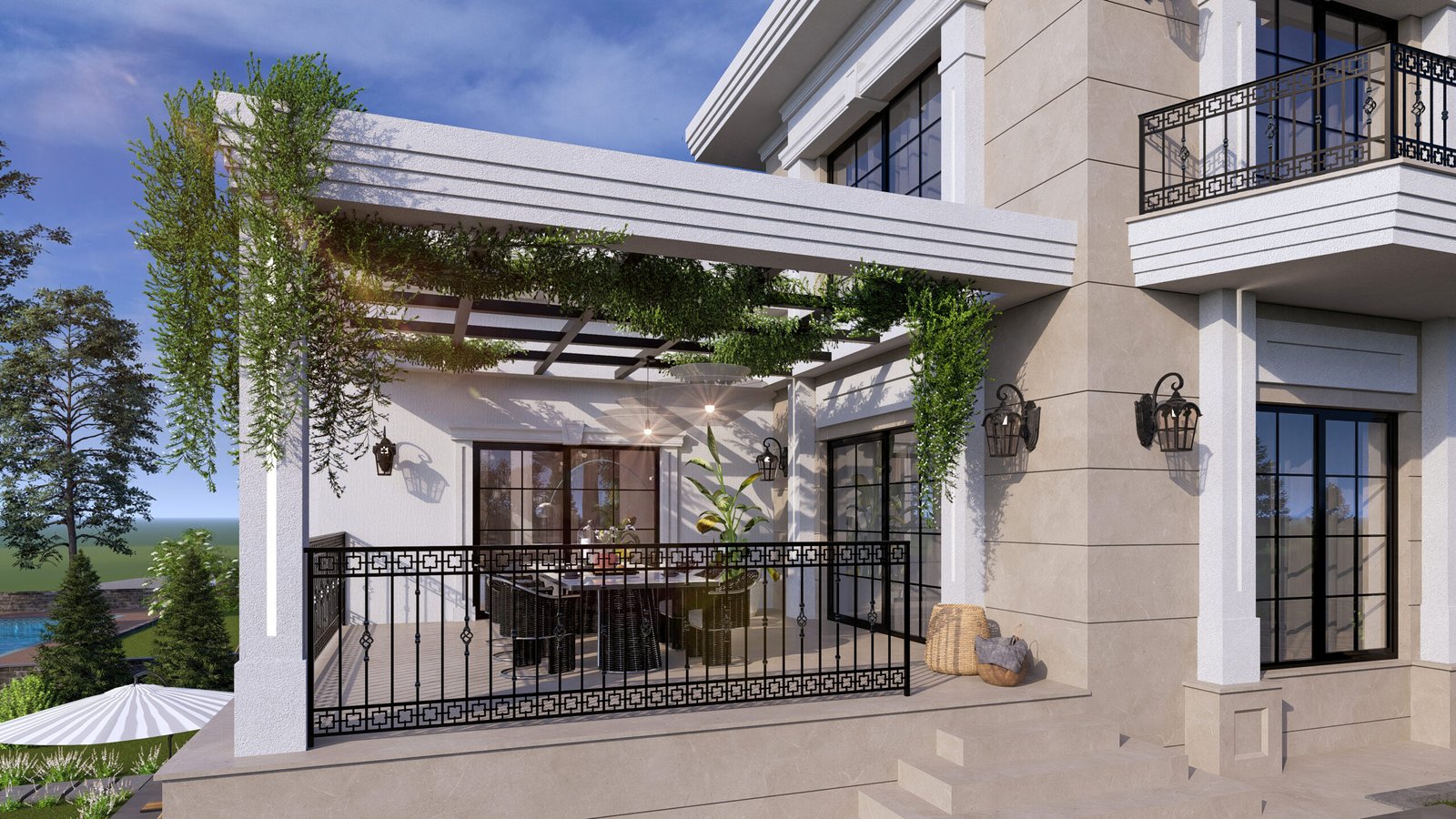 Villa Belvera’nın simetrik cephe tasarımı ve dengeli kütle oranları, yapının mimari bütünlüğünü güçlendirirken; beyaz cephe dokusu, geniş açıklıklarla birleşerek ferah yaşam alanları oluşturur.